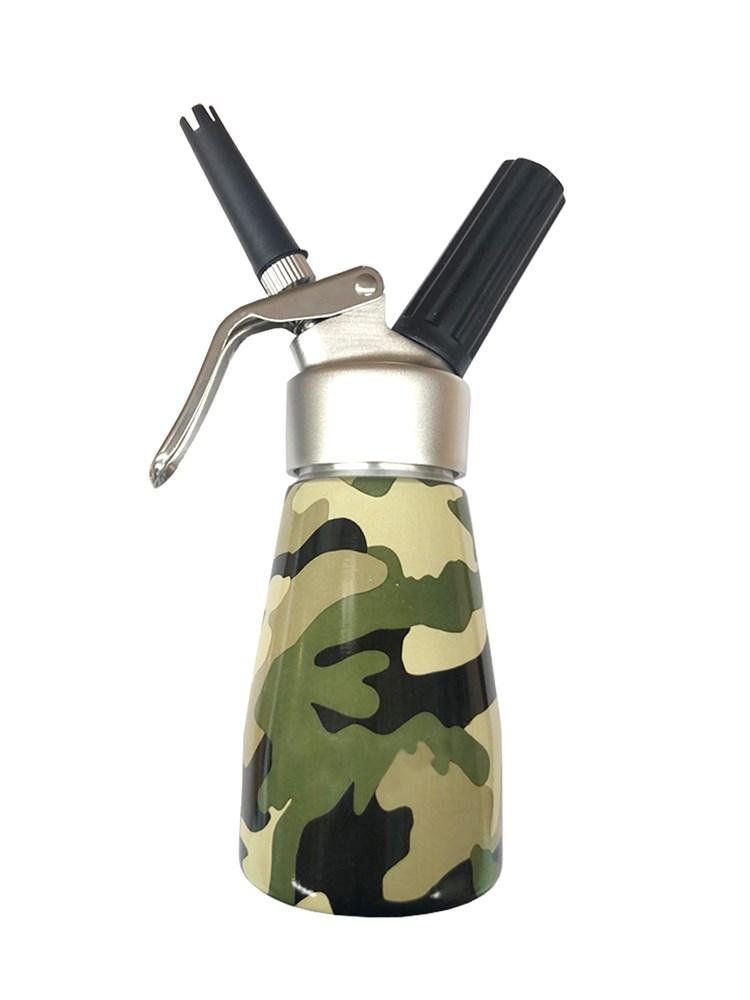 This 250ml model typically features an aluminum alloy head and bottle, often with 3 decoration tools and a cleaning brush. Its camouflage color offers a distinct aesthetic. It requires 8g N2O gas chargers.